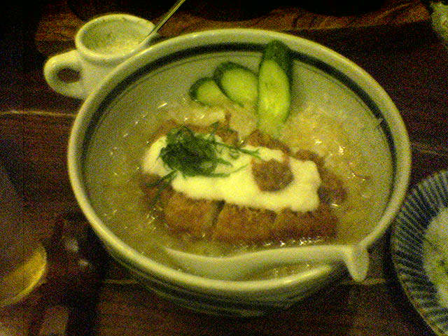 ご飯に出汁と氷を張って、カツを乗せ、