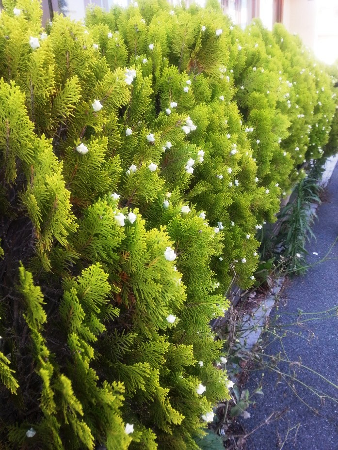 通り沿いの植え込みに何か白いものが付いている。